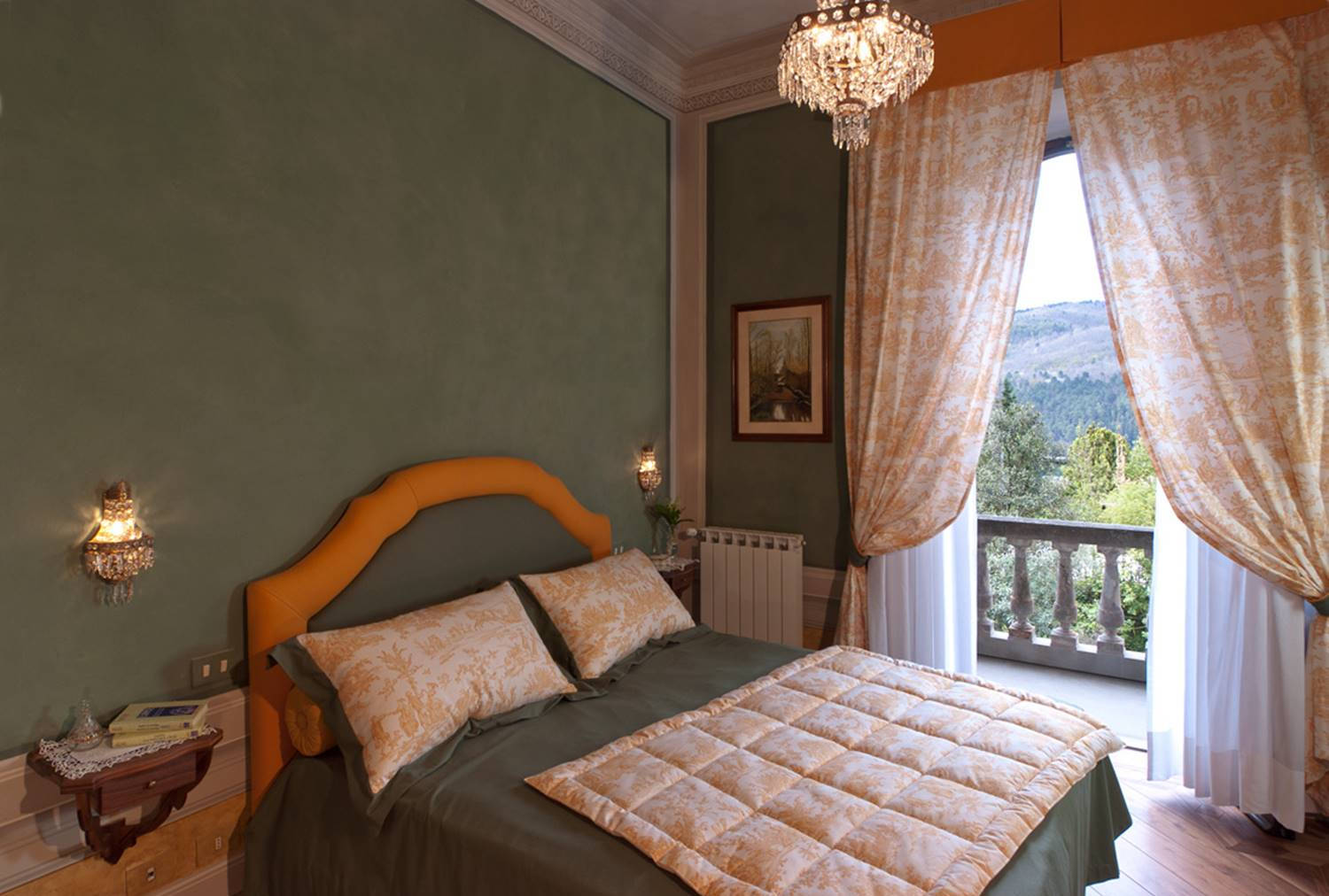 La camera Verde si trova davanti alla Gialla non a caso, al colore del sole legato al cielo si contrappone il colore della Natura e della Terra.È un colore che distende le tensioni, simbolo di costanza e perseveranza; è anche il colore della Primavera e quindi della rinascita delle piante e del risveglio dei sensi.