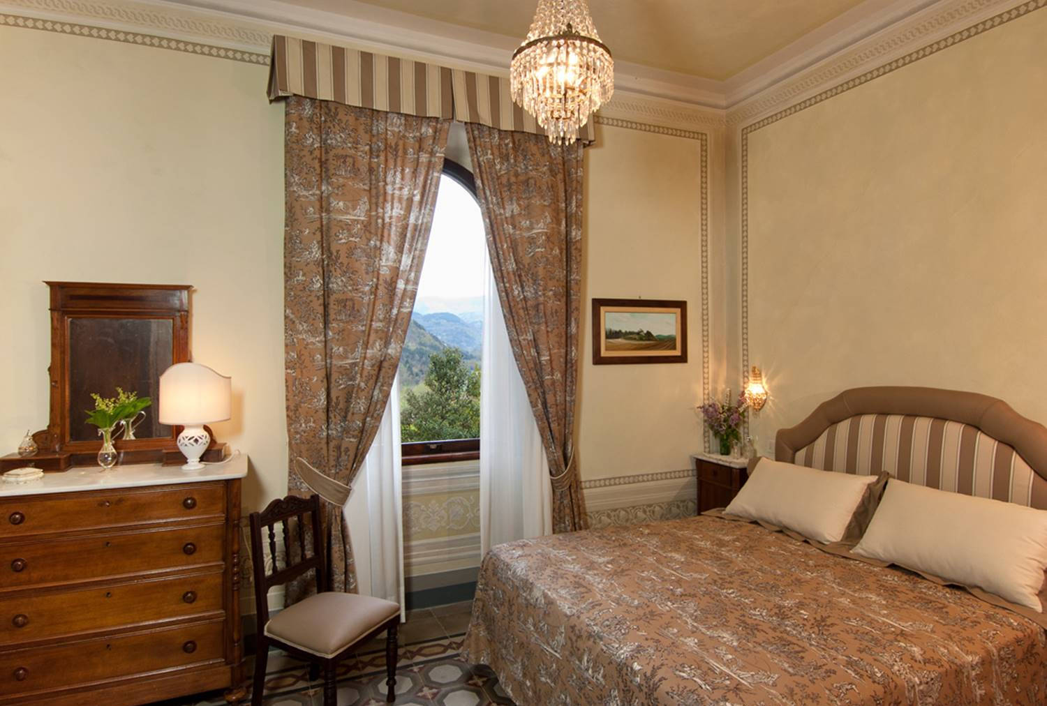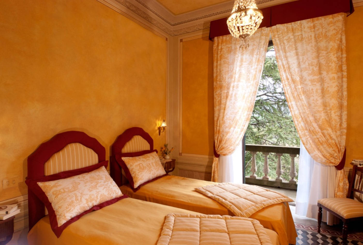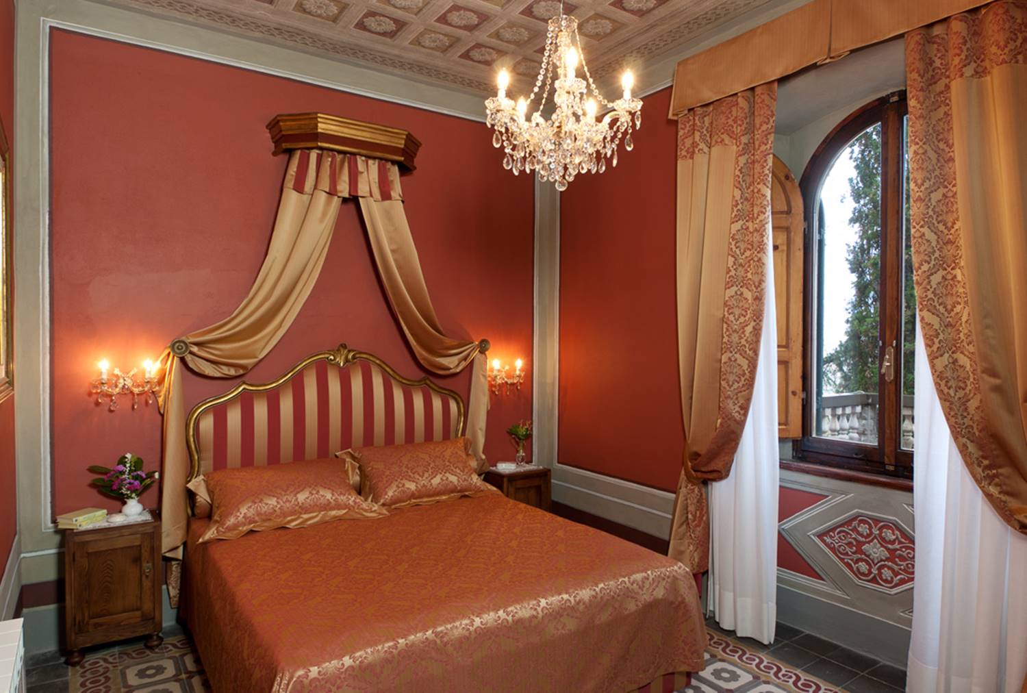 Questa stanza è dello stesso colore delle domus di Pompei, è un colore importante che ricorda l’amore, la passione e la sensualità; abbiamo pensato di risaltarlo con la preziosità dei damaschi e dell’oro delle coperte, dei tendaggi e del baldacchino che sovrasta il letto, dando a questa stanza un aspetto del tutto diverso dalle altre e decisamente regale.